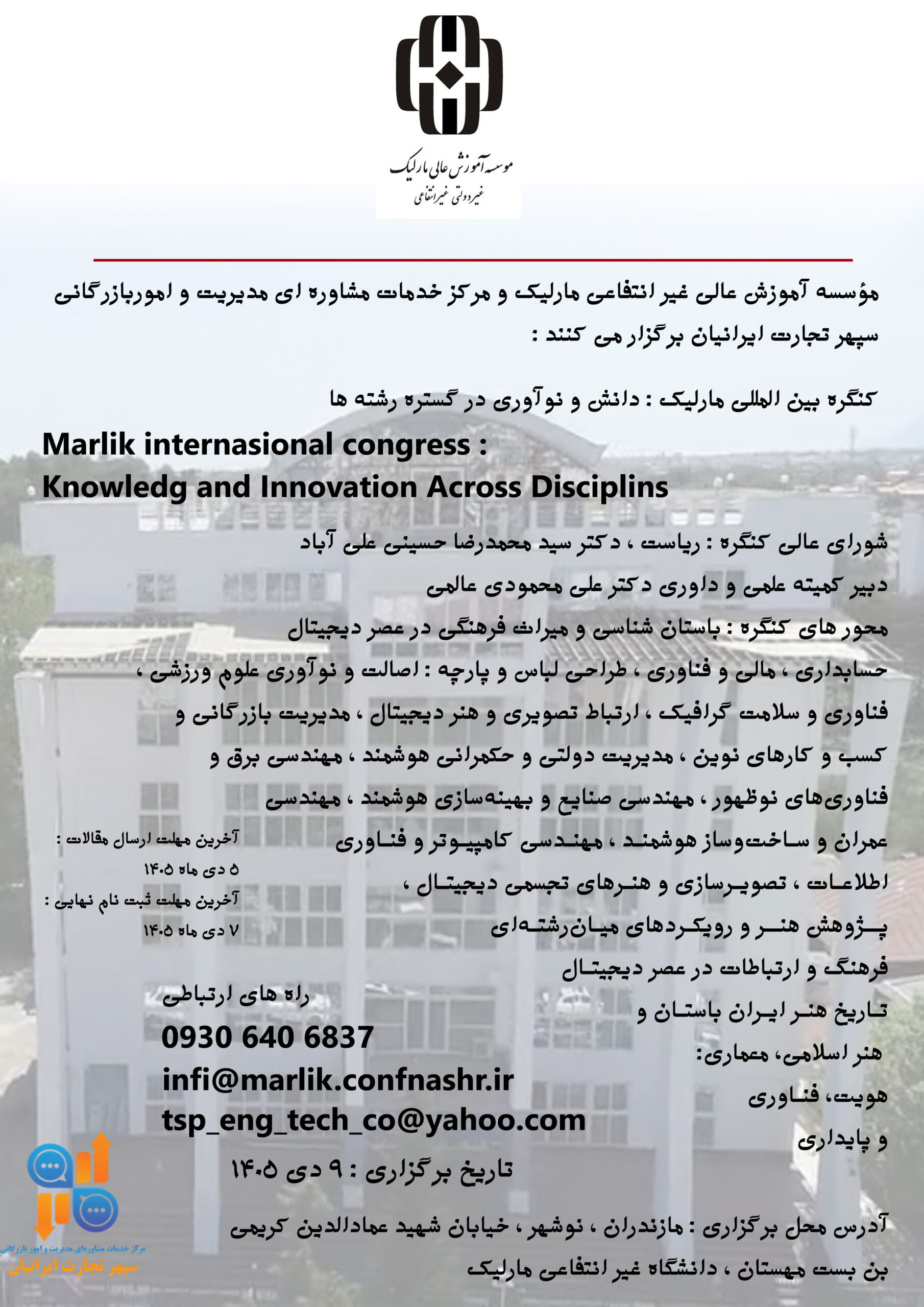 این کنگره در تاریخ نهم دیماه ۱۴۰۵ در محل دانشگاه مارلیک برگزار خواهد شد و میزبان پژوهشگران و علاقهمندانی است که باور دارند آینده علم و توسعه از مسیر همکاری، خلاقیت و گفتوگوی سازنده میگذرد. چنین رویدادی فرصتی مغتنم برای ارائه دستاوردهای نو، ایجاد شبکههای علمی تازه و تقویت جریانهای پژوهشی پویا است؛ جریانی که بتواند نقش مؤثری در شکلگیری راهحلهای نوین و پایدار برای چالشهای روبهپیش جامعه داشته باشد.
